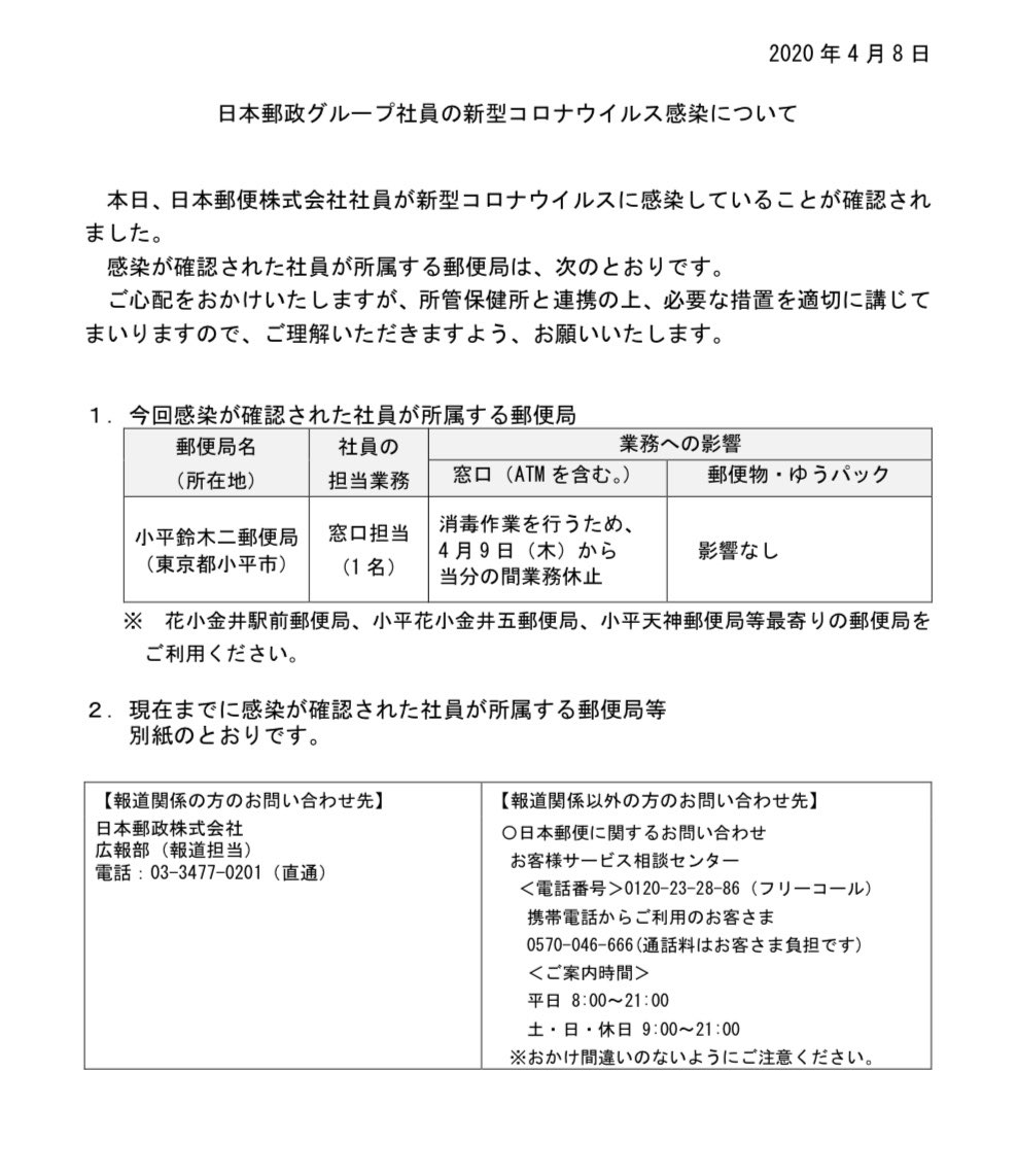 O Xrhsths Okippa オキッパ 在宅でも非対面で簡単に宅配物が受取れる Sto Twitter コロナ感染各配送会社発表情報 2020 4 8 日本郵便 小平鈴木二郵便局 東京都小平市 窓口担当 1 名 消毒作業を行うため 4月9日 木 から 当分の間窓口業務休止 対象